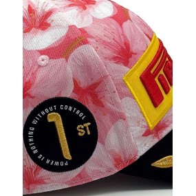 La corona è decorata con una stampa Sakura, omaggio alla celebre stagione dei ciliegi in fiore in Giappone e all’atmosfera unica del weekend di gara a Suzuka. Sul pannello laterale, la marcatura “日本 2026” con data ricamata ancora il cappellino al calendario ufficiale del Gran Premio, mentre sul lato opposto compare l’insegna circolare “1st – Power is Nothing Without Control”.